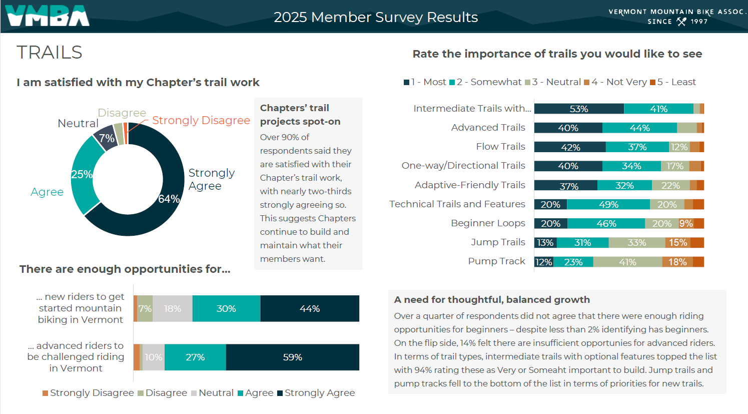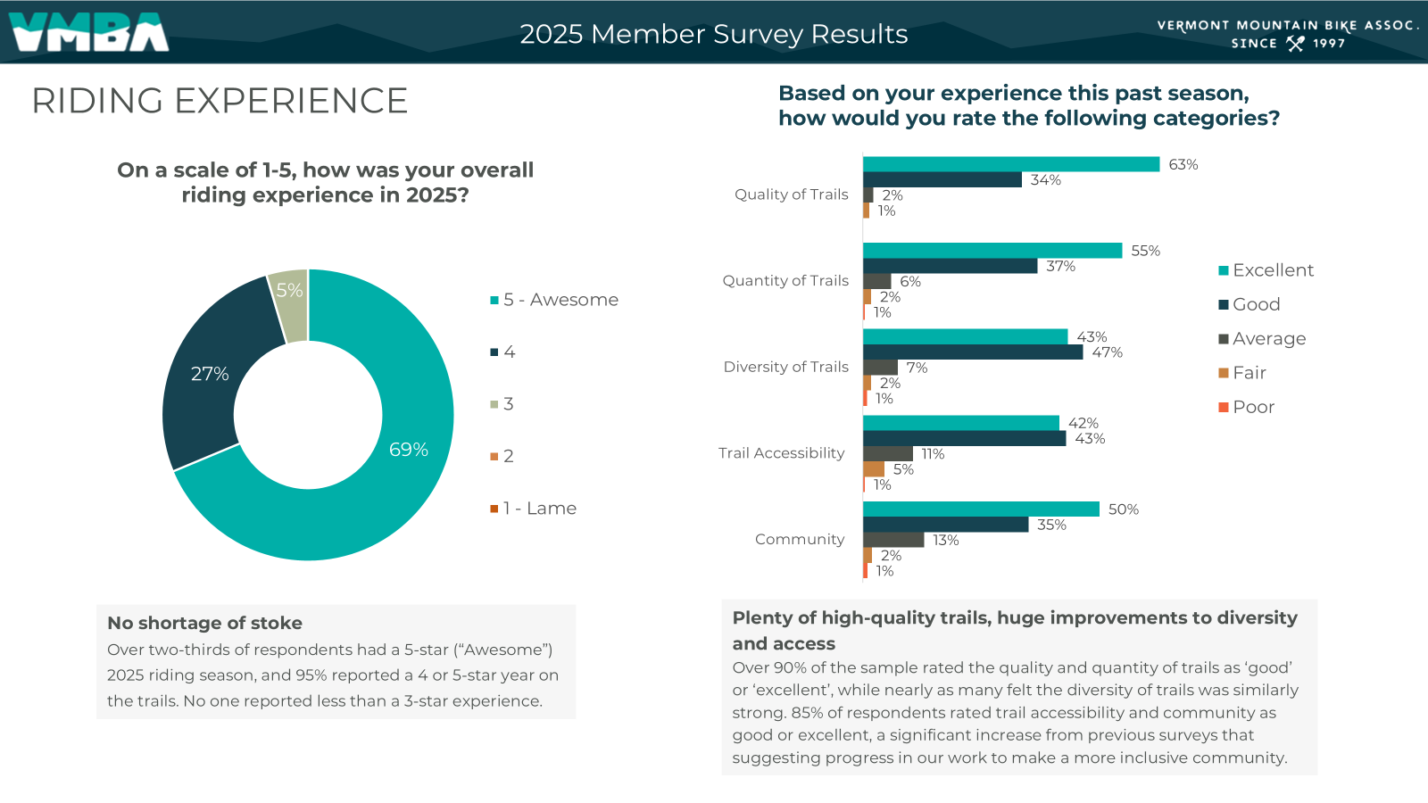 Respondents were overwhelmingly positive about their overall experience out on the trails in 2025, with an average rating of 4.7 out of 5 and nearly 70% reporting a 5-star season. And while many factors influence this overall impression, including an abnormally dry summer, it’s clear that the quality and quantity of trails is a major factor. 97% of respondents rated the quality of trails as “good” (4/5) or “excellent” (5/5), with 92% feeling similarly positive about the quantity of trails. Trail diversity and accessibility also rated nearly as high, underscoring how good the riding is here in Vermont. Community is another major driver of overall experience, which 85% of the sample identified as “good” or “excellent.” As much as we look for opportunities to improve, these findings definitely make us feel good about the progress we are making on the Trails and Community goals in our 5-year Strategic Plan.