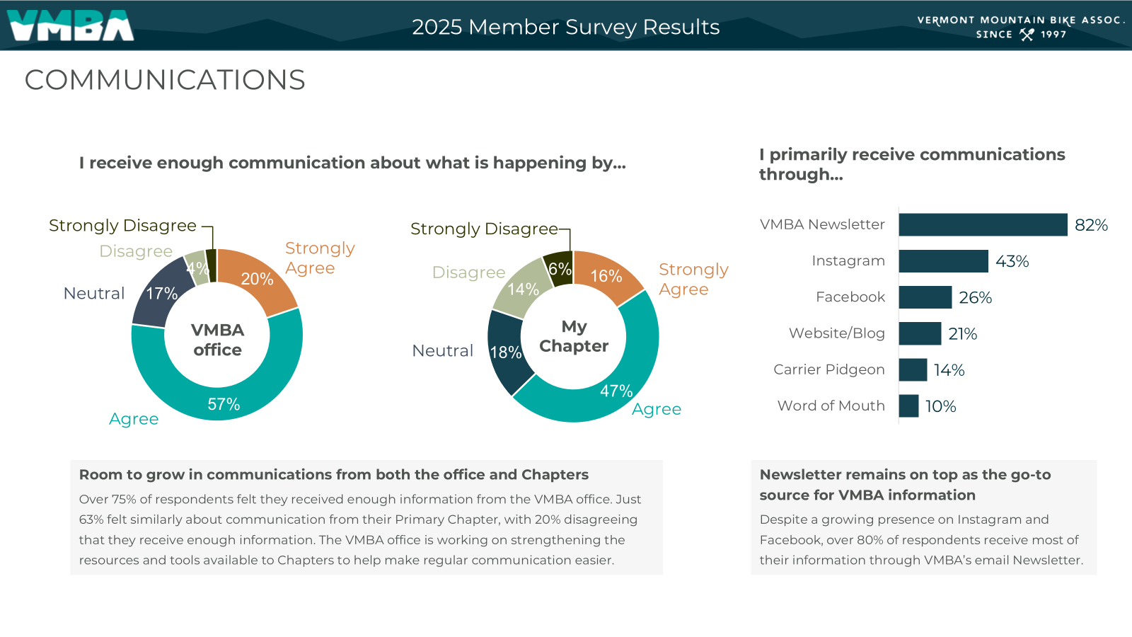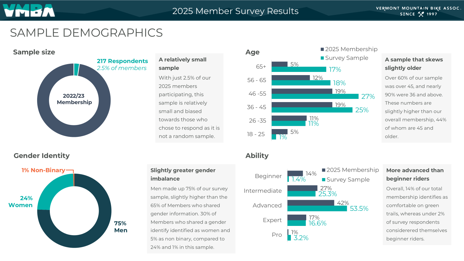 Our annual membership survey is a critical tool in our work to ensure the sustainability of mountain biking in Vermont and use advocacy, education, and community-driven stewardship to promote exceptional riding experiences for all. It helps us better understand our Members, their needs & wants, and where we are succeeding as well as where we can improve as an organization.