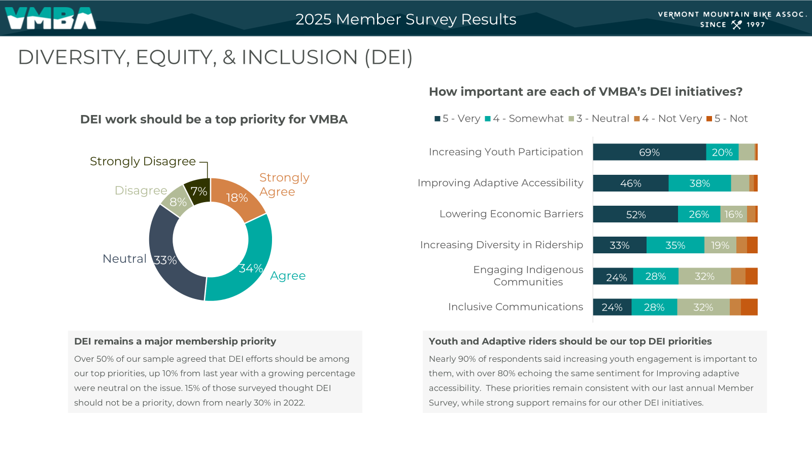 In terms of the specific DEI initiatives VMBA is currently pursuing, nearly 90% of respondents said increasing youth engagement is important to them, with over 80% echoing the same sentiment for improving adaptive accessibility. These priorities remain consistent with our last annual Member Survey, while strong support remains for our other DEI initiatives. Overall, the survey findings suggest Members generally support our approach to improving diversity, equity, and inclusion in the MTB community and want it to remain part of our mission.