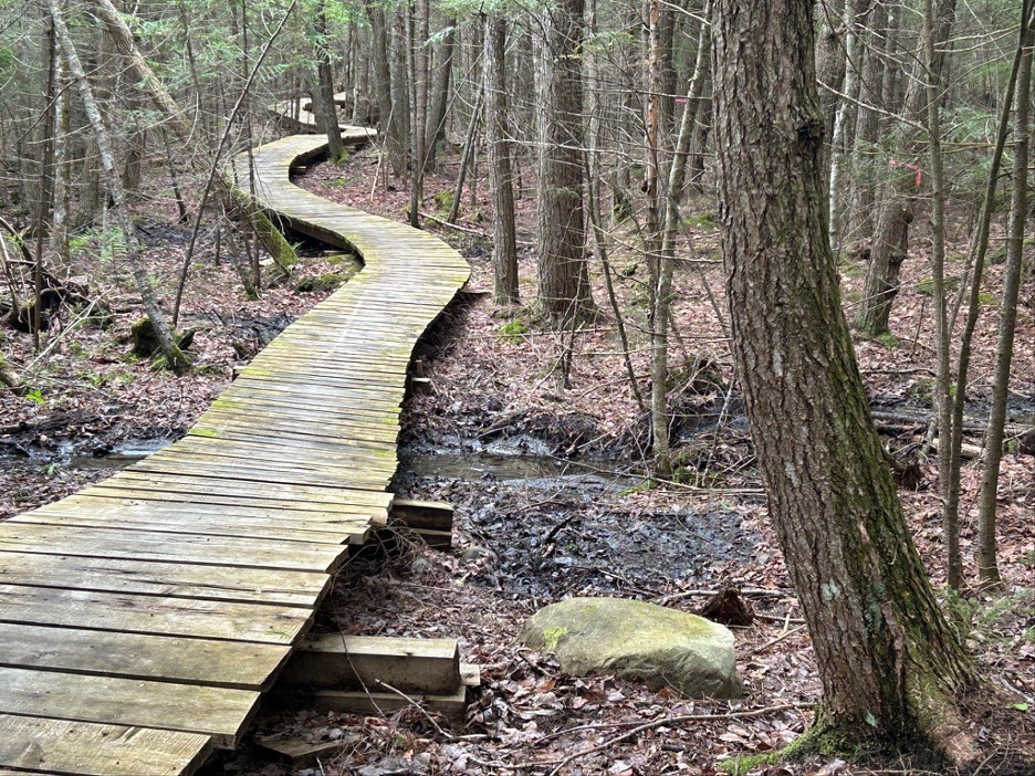 Big surprise, this was my first ride of the year. I happen to own and maintain this network in North Montpelier. According to the Trek Ride Club app, which I am using to document all my rides, this is a 4.8 mile ride with 1,713 feet of elevation change, not bad for a 70-acre parcel of land. The entire network is hand-built and features narrow, mildly technical single track with numerous jumps and a few bridges. Every feature can either be rolled or has a go-around so there are no mandatory airs. There is a map by the marked parking area at the entrance and another at a trail confluence mid-way through the ride. There are some directional arrows and trail signs but in general just keep going starlight and the network unfolds into one long sinuous route. The only trail that is ridden twice is Double Up, a short connector trail near the end of the ride. The network is on Trailforks, is open to the public and dries quickly after a rain.