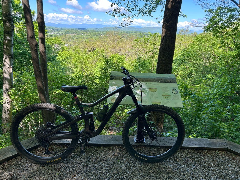 This was a new network for me. Even though I attended Middlebury College, most of these trails didn’t exist for biking when I was there. I parked on Springside Road (there are many access points) and started out on Chipman Hill which rises right above the town. The club’s Website recommends climbing Super 7 to the top, which I did, then descended Rehab (which may have been renamed Old Pine?) and climbed again and descended Carls to Tweedle Dee. Of these four trails, only Super 7 is on the Trailforks map or the list of trails on their Web site map, so I was a little confused the whole time. There are lots of walking trails and side trails on Chipman Hill and I found myself checking my location more than usual. Many of the trails feel like hiking trails that have been opened to biking, but Old Pine is a fun descent that felt purpose-built for bikers. After another climb to the top I dropped down the east side on Sidewinder. Except for one section that went straight down the fall line and was just hard braking the whole way, this is a fun and fast trail, just watch for hikers. After leaving Chipman Hill I used the Trail Around Middlebury (TAM) to connect to another zone called Means Woods. This area features a long narrow ridge with a technical loop on it called Megawatt. Though not a huge physical test, it is one of the more challenging tech trails I have ridden in a while, especially in damp conditions. There are loads of rocky shelves and tight corners to negotiate. I then used the TAM to connect over to a third zone: Battell Woods. There were loads of trails in this area with some short climbs and challenging rocky features. The TAM runs right through it so even if you feel lost, you eventually come across the TAM and can find your way out to the north or south.